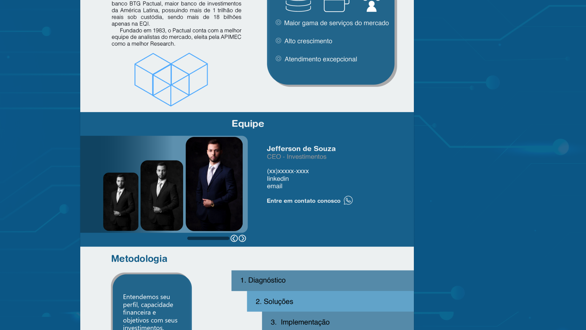 O projeto desenvolvido resultou em uma one page e três landing pages. Com isso buscamos apresentar a empresa de forma objetiva e eficiente, visando a captação desses clientes.
